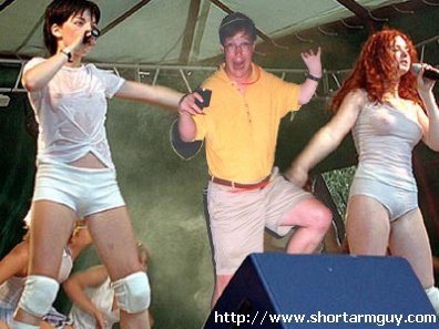 An amazing thing happened to ShortArmGuy this week. After featuring the hot new pop singers T.A.T.U. on his website last week, the girls found out about ShortArmGuy. They invited him to attend one of their concerts and backstage after the show. After only a few minutes of talking with one another, the gals asked ShortArmGuy to "join their group". Which makes a bunch of sense because, as we all know, ShortArmGuy really has a way with 18 year old, Russian, Lesbian, Rock Stars!